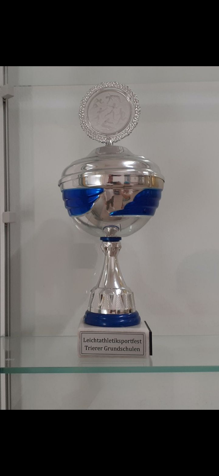 Liebe Schüler, liebe Eltern, die Auswahlmannschaft (Schülerinnen und Schüler der dritten und vierten Klassen) der Grundschule St. Peter hat am Dienstag, 20.06.2023 im Trierer Stadion den Leichtathletikwettkampf gewonnen. Frau Frank und ich haben die Schülerinnen und Schüler nach Trier begleitet. Einige Eltern waren ebenfalls dabei, haben die Kinder mit uns begeistert angefeuert und durften den tollen Sieg miterleben. Es war ein grandioses Ereignis, dass die Schülerinnen und Schüler, Frau Frank und ich und natürlich auch die Eltern nicht so schnell vergessen werden. Was für ein Augenblick! Ich gratuliere der Auswahlmannschaft nochmals ganz herzlich und freue mich für die gesamte Schulgemeinschaft. Der Pokal hat schon einen Ehrenplatz in unserer Vitrine gefunden und darf dort von allen Schülerinnen und Schülern angeschaut werden. Mit sportlichen Grüßen C. Haag, Schulleiterin