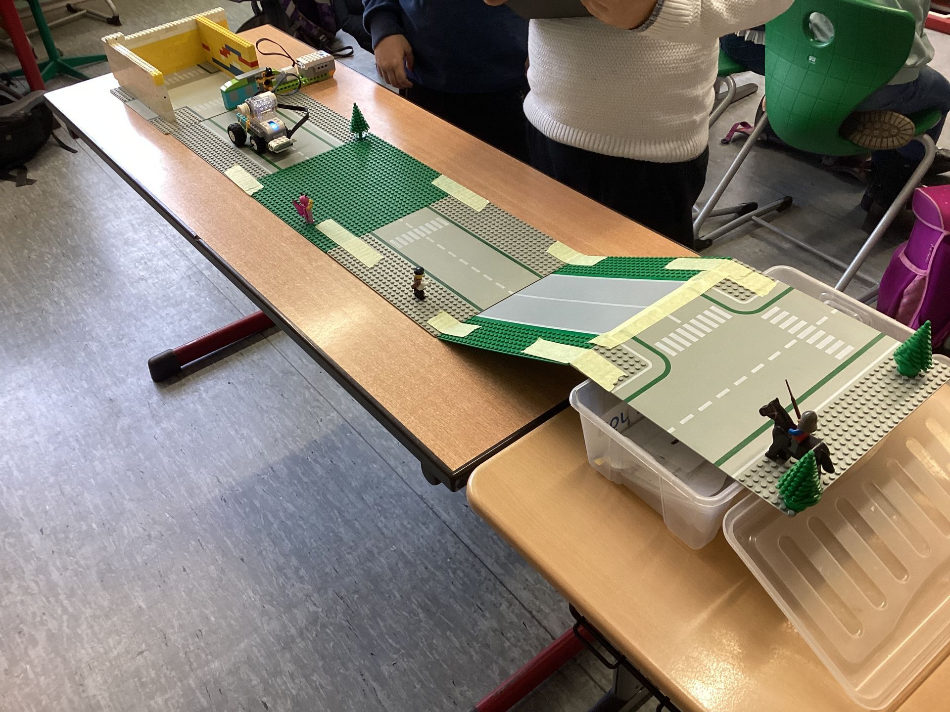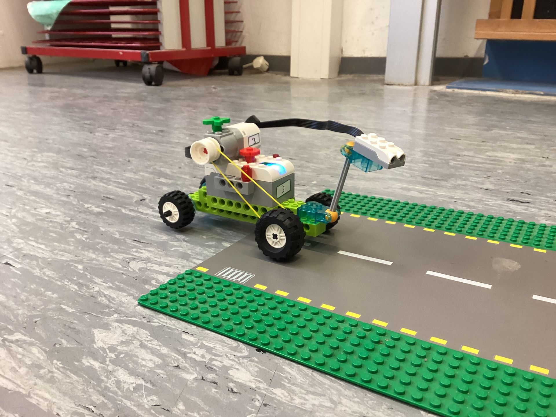 Die Klasse 3c hat in der letzten Woche Lego Roboter gebaut, die man programmieren kann. Der Roboter sollte einen Planeten eigenständig erkunden können. Wir sollten in der ersten Stufe einen Roboter programmieren, der geradeaus und dann rückwärts fahren kann. In Stufe zwei muss der Roboter bei einem Hindernis stoppen, einen Ton abspielen, warten und dann weiter fahren. Bei Stufe drei mussten wir den Roboter umbauen, damit er den Hügel hochkommt. Bei der letzten Entwicklungsphase muss man eine Garage programmieren. Die Garage soll aufgehen und warten, bis der Roboter draußen ist. Dann muss der Roboter die Teststrecke wie in Stufe drei abfahren und von alleine zurückkommen. Die Garage soll wieder aufgehen und wenn der Roboter wieder in der Garage ist, soll die Garage von alleine zugehen.